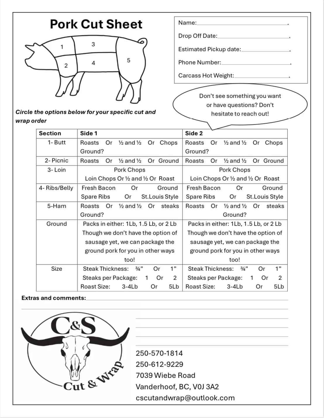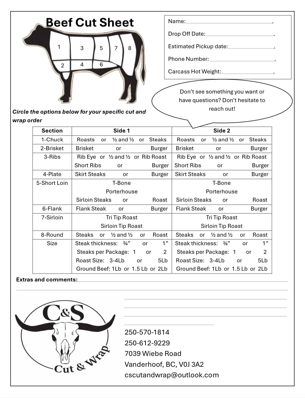 Check out our fantastic selection of domestic cut sheets for the various options we proudly offer. If you don't see a specific cut that catches your eye or if you have any questions at all, please don’t hesitate to reach out to us. We are here to assist you and will gladly help guide you through the process!